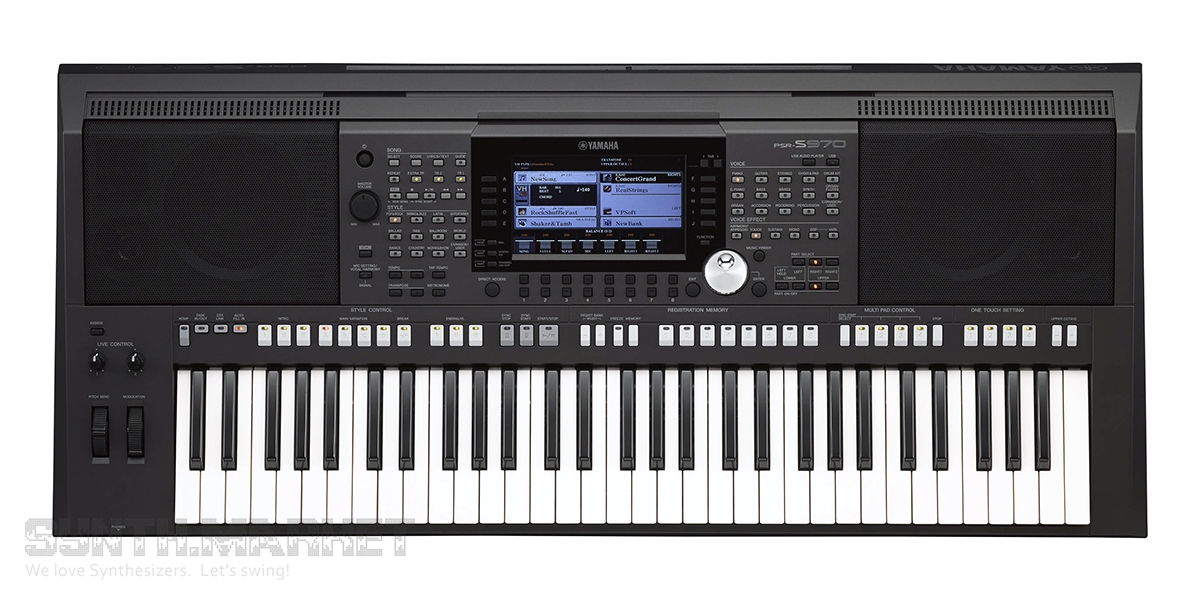 S970 offers a 61-note keyboard with 5 touch response modes, AWM Stereo Sampling tone generator technology, 128 voices of polyphony, 131 Super Articulation!, 30 Mega, 31 Sweet!, 74 Cool!, 89 Live!, 30 Organ Flutes! sounds of the same great quality Tyros features (989 «Voices» programs). Auto accompaniment offers 450 preset styles (3 Intro control variations, 4 Main variations, 4 Fill, Break and 3 Ending) as well as includes Music Finder possibilities (up to 2500 records) and OTS (one touch settings) assigning 4 various settings per style. Quick, Multi or Step record allows managing up to 16 tracks. Among many functions there are Registration Sequence, tempo, tuning, transpose, scale type and the functions for programs, styles and songs. Recording in WAV (44kHz, 16 bit, stereo) lasts up to 80 minutes; time stretch, pitch shift, vocal cancel functions are available.