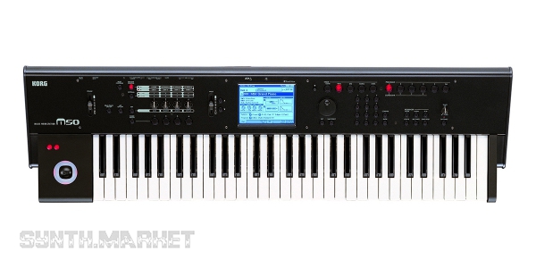 And that’s when Korg went the other way – instead of engineering sophisticated and stunning machines the developers who’ve been already sitting at the very top of the world decided to simply enjoy the ride (down the Olympus): Korg began to cut off anything “extra” making it cheaper and just reap the rewards. That’s how Korg M50 was devised – a good example of what we’re trying to figure out about Korg. M3 was undercut by its direct successor M50 (more than three times cheaper). Some features were gone together with the price: polyphony (80 voices vs 120), standard pads and sliders, audio sequences creation possibility and that famous KARMA arpeggiator which was given to M3 and OASYS while M50 was “flashed back” to Triton’s patterns. Dynamic Drum Tracks helped to build drum beats. Anyway, M50 didn’t compromise anything supplying best quality to us and proving to be as good as its predecessor. It is based on M3 Extended Definition Synthesis sound engine and also sports REMS (Resonant structure and Electronic circuit Modelling System) onboard. As for the instruments you’ll find here 608 brilliant mono patches: from re-created magic Korg SG-1 piano to brisk lead and aggressive drum sounds. M50 will help you discover their character offering 384 possible combinations featuring an equalizer per part. The workstation comprises 256 Mb of PCM data, a 61-note version with the semi-weighted Natural Touch keyboard while an 88-note keyboard features the Real Weighted Hammer Action 3 (RH3) technology. Besides, M50 was made to be greatly compatible with DAW. There are only 2 audio outputs, MIDI in/out, 3 jacks for pedals, USB and the ability to save recorded data onto an SD-card up to 2 Gb. The display replicates the one you could see in M3 but here it’s actually monochrome – as Triton featured – which is another budget solution.