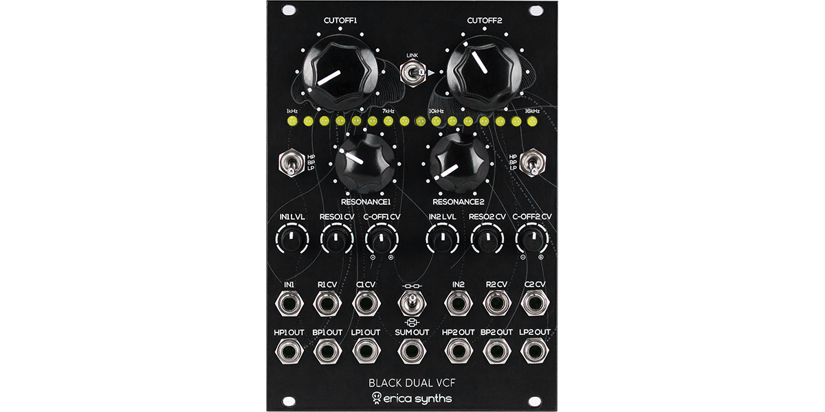 Erica Synths has recently introduced the Erica Black VCF module. The module is represented with a dual multimode filter circuit featuring a voltage controlled resonance and cutoff. The module is built on the AS3320 chip. The specs include HP, BP and LP simultaneous outputs, summing output, Link switch for controlling both VCFs (with one cutoff or resonance knob), 16-band spectrum analyser.