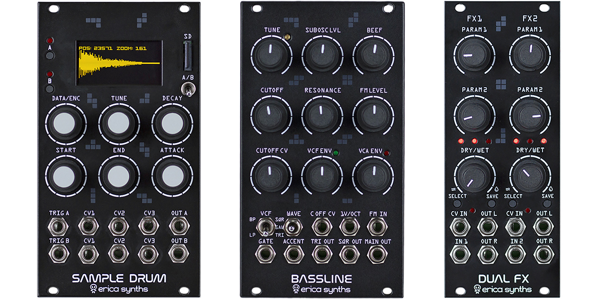 Erica Synth привезли с собой на выставку целых три новых модуля, которые отлично подойдут для живых выступлений. Первый из них - Sample Drum - позволяет работать с двумя загруженными с microSD сэмплами или лупами, используя 6 различных параметров и множество входов CV. Для удобства в него добавлен небольшой экран. Bassline, второй из продемонстрированных модулей, представляет собой полностью аналоговый синтезаторный модуль, в котором есть осциллятор с тремя формами волны, фильтр, а также транзисторный саб осциллятор и два BBD для эмуляции расстройки осциллятора. Третий из модулей - Dual FX. Это эффект-процессор с 8 моно/стерео эффектами, каждый из которых имеет по два параметра. Для удобства использования этого модуля во время выступлений, настройки каждого эффекта можно сохранять. Все три модуля выйдут на рынок в середине июня.
